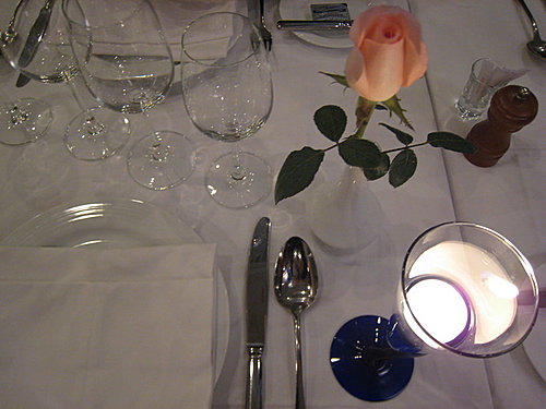 一進門,廚師裝扮的老闆就很親切地問候我們並帶我們到座位。一共有9人,所以是個長桌;桌上放著玫瑰花和藍色燭台、酒杯、水杯等。等大家都到齊了,老闆就一方面一個人一個人地發著菜單,一方面解說他的是法國的“道地的家鄉菜”,而他最強調的是他所用的醬,每一種醬汁都是他精新調配的,甚至強調鱸魚的醬汁甚至比鱸魚來得貴!